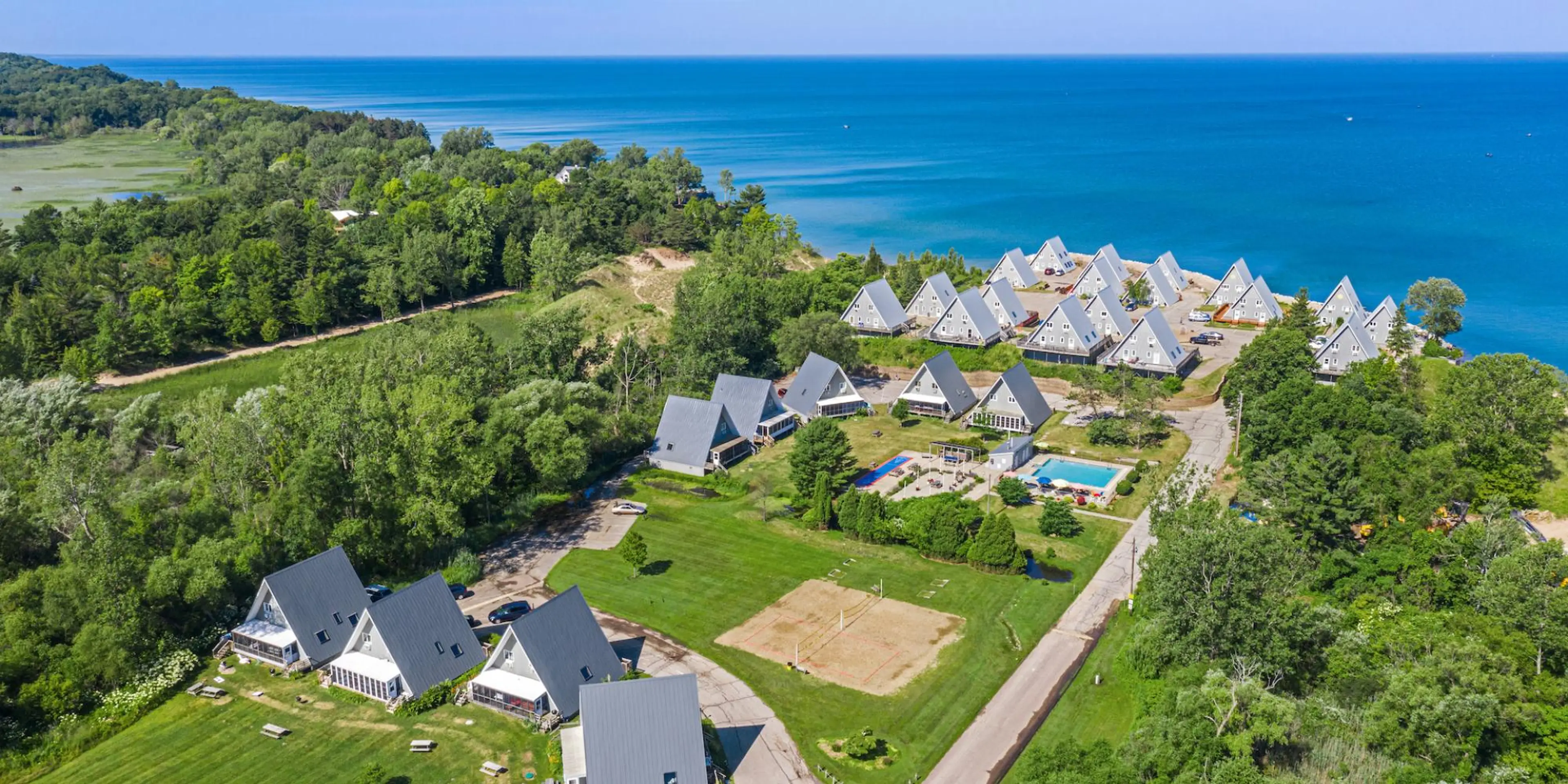 Discover the essence of comfort and convenience at Chalet on the Lake. Explore our chalets' key details, from our serene location near Lake Michigan ensuring a delightful stay. Dive into a world of amenities, including two inviting swimming pools, direct access to Lake Michigan's pristine beach, tennis courts, a dedicated kids' playing area, shuffleboard, and a beach volleyball court. Your journey to relaxation and recreation begins here.